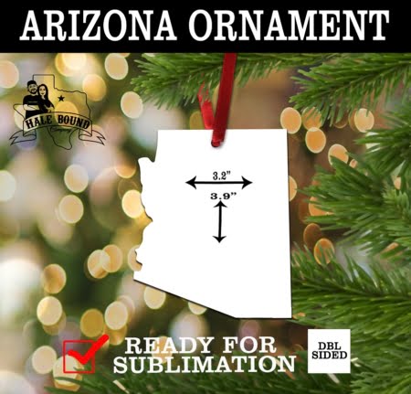 The ARIZONA MDF ORNAMENT with added personalization will complement and Christmas tree. These ornaments will be great sellers this holiday season and most importantly be treasured by your customers for years to come! Size 3.2″ x 3.9″ Dbl Sided 1/8 thick