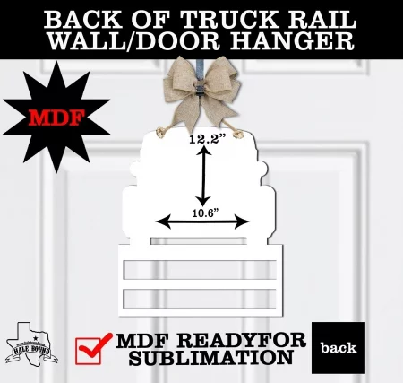 The MDF Back of Truck Rail wall/door hanger is appx 5 mm thick. Appx size is 12.2″ x 10.6″. It has 2 holes for hanging and 2 Rail slots for adding bows & ribbon. Single-sided coated for sublimation with A black backside.