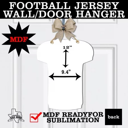 The MDF Football Jersey wall/door hanger is appx 5 mm thick. Appx size is 12″ x 9.4″. It has 2 holes for hanging. Single-sided coated for sublimation with A black backside.