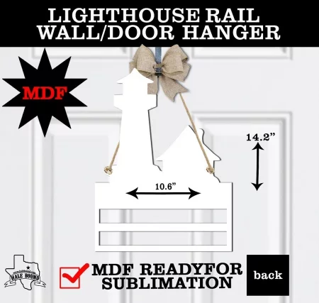 The MDF LightHouse Rail wall/door hanger is appx 5 mm thick. Appx size is 14.2″ x 10.6″. It has 2 holes for hanging and 2 Rail slots for adding bows & ribbon. Single-sided coated for sublimation with A black backside.