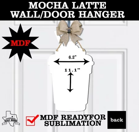 The DISC-MDF Mocha-Latte wall/door hanger is appx 5 mm thick. Appx size is 11.1″ x 6.2″. It has 2 holes for hanging. Single-sided coated for sublimation with A black backside.