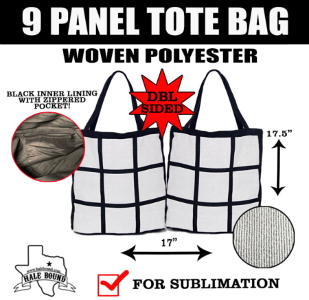 Item Details: 80%Polyester/20% cotton. Bag Size is 17.5″ x 17″. Has inner pocket with zipper. Double-sided for a total of 18 panels!. Panel size is approximately 4.57″ x 4.57″ for sublimation printing.