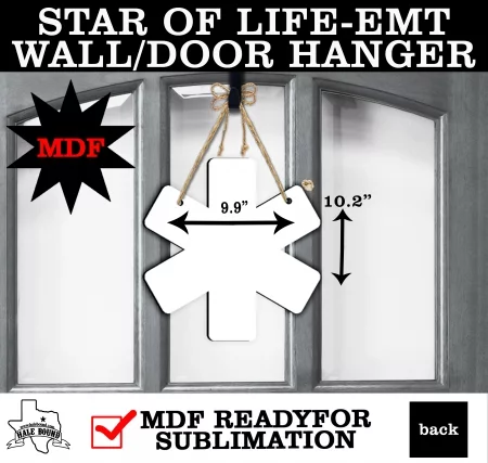 The Star of Life-Emt wall/door hanger is appx 5 mm thick. Appx size is 10.2″ x 9.9″. It has 2 holes for hanging. Single-sided coated for sublimation with A black backside.